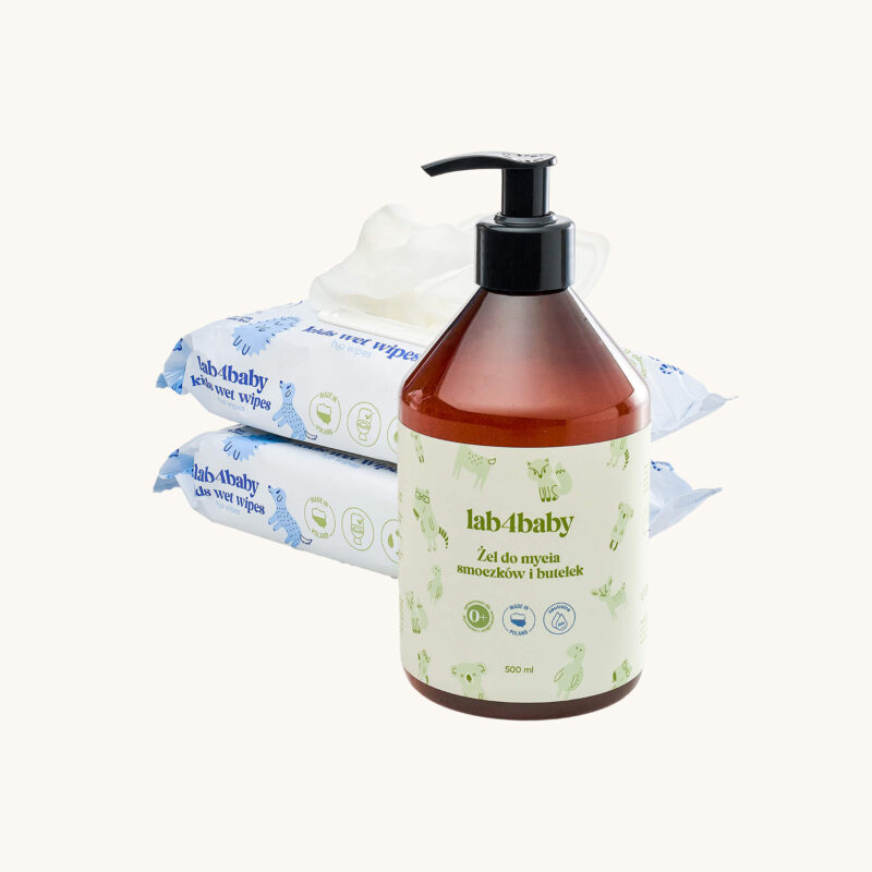 Zestaw zawiera żel do mycia smoczków i butelek 500 ml oraz mokre chusteczki H₂O kids wet wipes 2×60 szt.