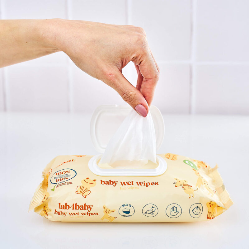 Ultradelikatne i bezpieczne. Chusteczki H₂O baby wet wipes od lab4baby to naturalna pielęgnacja i oczyszczanie wrażliwej skóry – idealne od 1. dnia życia.