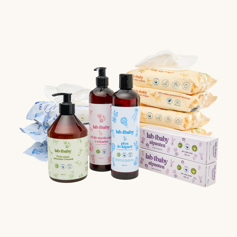 Zestaw zawiera wszystkie produkty linii lab4baby. Płyn do kąpieli 400 ml, żel do mycia ciała i włosów 400 ml, żel do mycia smoczków i butelek 500 ml, maść Alpanten 2×100 g oraz mokre chusteczki H₂O baby wet wipes 5×60 szt. i H₂O kids wet wipes 3×60 szt.
