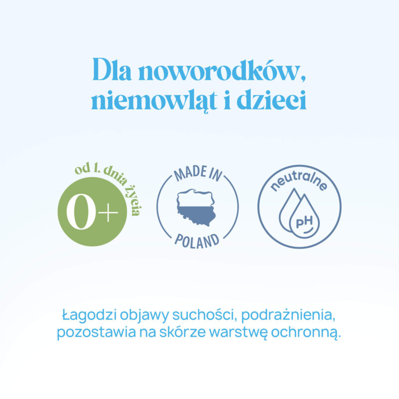Płyn do kąpieli dla noworodków od 1. dnia życia, niemowląt i dzieci. Delikatny i bezpieczny produkt stworzony specjalnie z myślą o najmłodszych. Jego starannie dobrany skład zawiera składniki pochodzenia naturalnego, które zapewniają odpowiednią pielęgnację i ochronę dla skóry dziecka. Łagodzi objawy suchości, podrażnienia i pozostawia na skórze warstwę ochronną. Opracowany we współpracy z pediatrami i dermatologami. Produkt hipoalergiczny.