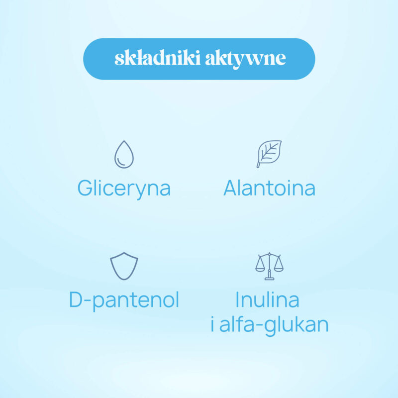 Gliceryna, alantoina, D-pantenol, inulina i alfa-glukan – składniki znane z właściwości nawilżających, łagodzących i wspierających naturalną barierę skóry.
