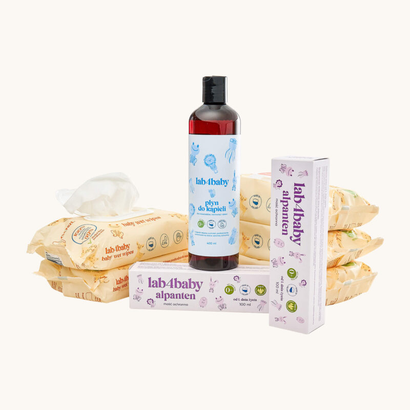 Zestaw idealny do wyprawki – delikatny płyn do kąpieli, dwa opakowania maści alpanten i zapas chusteczek H₂O baby wet wipes. Wszystko, czego potrzebuje skóra maluszka w codziennej pielęgnacji.