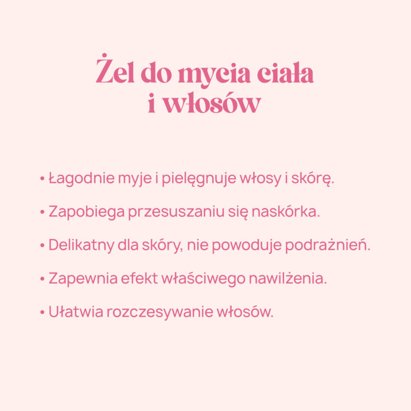 Z troski o delikatną i wrażliwą skórę Twojego maluszka powstał żel do mycia ciała i włosów dla dzieci, który delikatnie oczyszcza skórę i włosy dziecka. Można go stosować codziennie. Wzmacnia barierę skórną, nawilża i chroni bogactwo komórek macierzystych naskórka podczas każdej kąpieli.